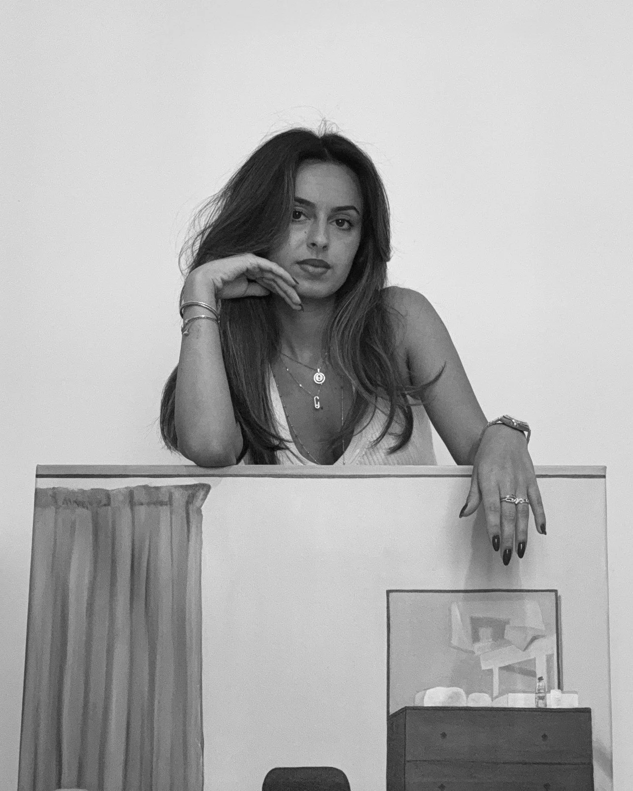 Her current work turns inward, exploring the intimacy of domestic spaces through a monochromatic lens. These paintings, grounded in acts of self-beholding, inhabit spaces imbued with personal resonance. Within this shift, the female body emerges subtly—not as a direct subject, but as a quiet undercurrent, a memory pressed into the fabric of familiar environments.